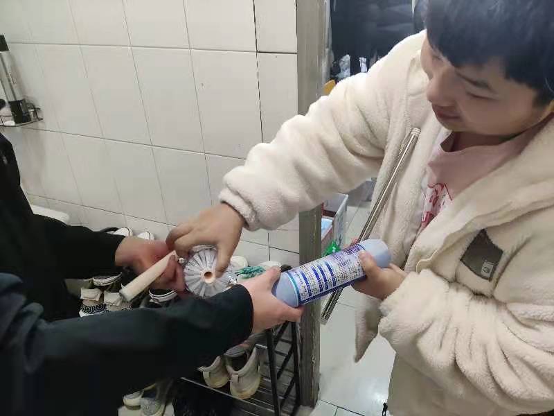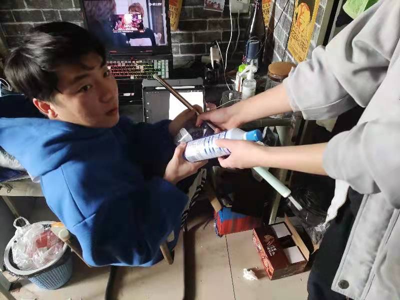 疫情期间,学生宿舍的清洁和消毒尤为重要,学院给男生宿舍发放了宿舍清洁用具:洁厕灵和刷子等,各宿舍快速高效的将卫生用品领取完毕,并立刻投入到打扫宿舍卫生中来。同学们利用发放的卫生用品对宿舍进行了彻底的清洁,在打扫过程中,同学们也没有丝毫松懈,认真细致,不放过任何一个卫生死角,而且各宿舍分工明确,保证每位同学都有对应的工作。