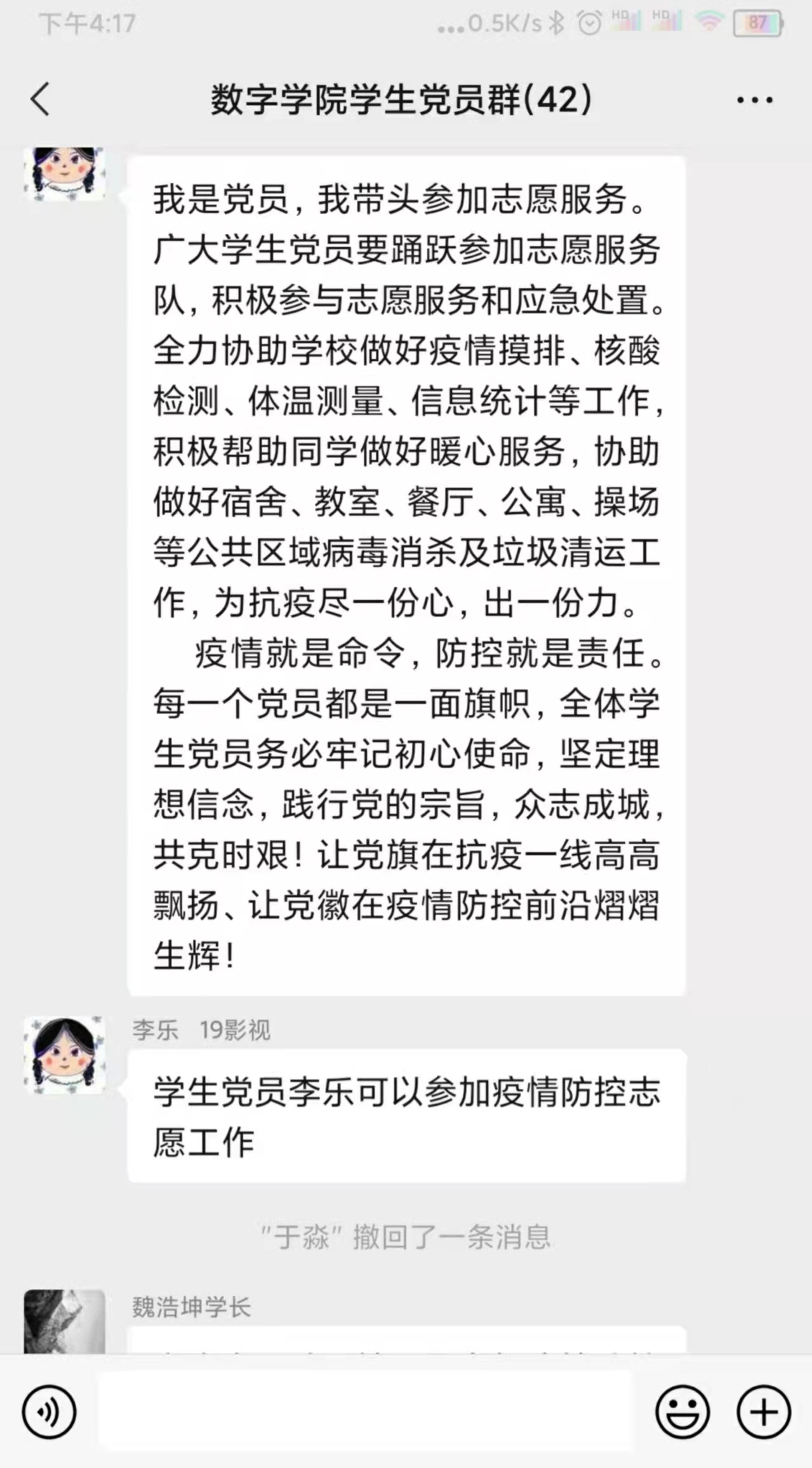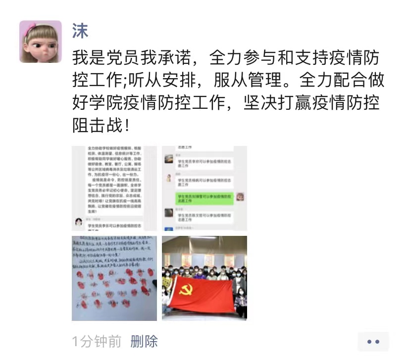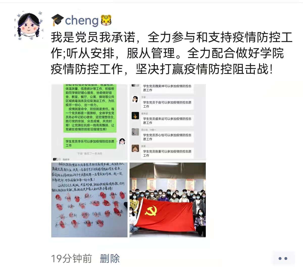 近日,我院学生党员纷纷在网上发声。我是党员我承诺,全力参与和支持疫情防控工作;听从安排,服从管理。全力配合做好学院疫情防控工作,坚决打赢疫情防控阻击战!