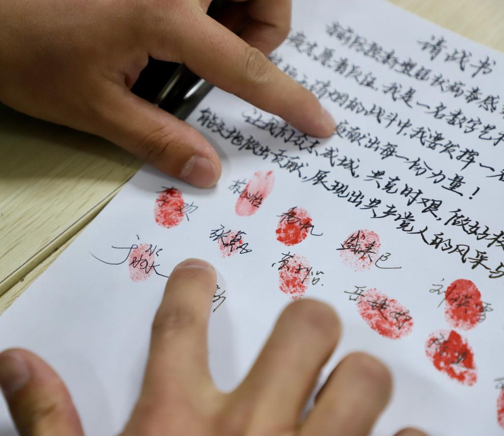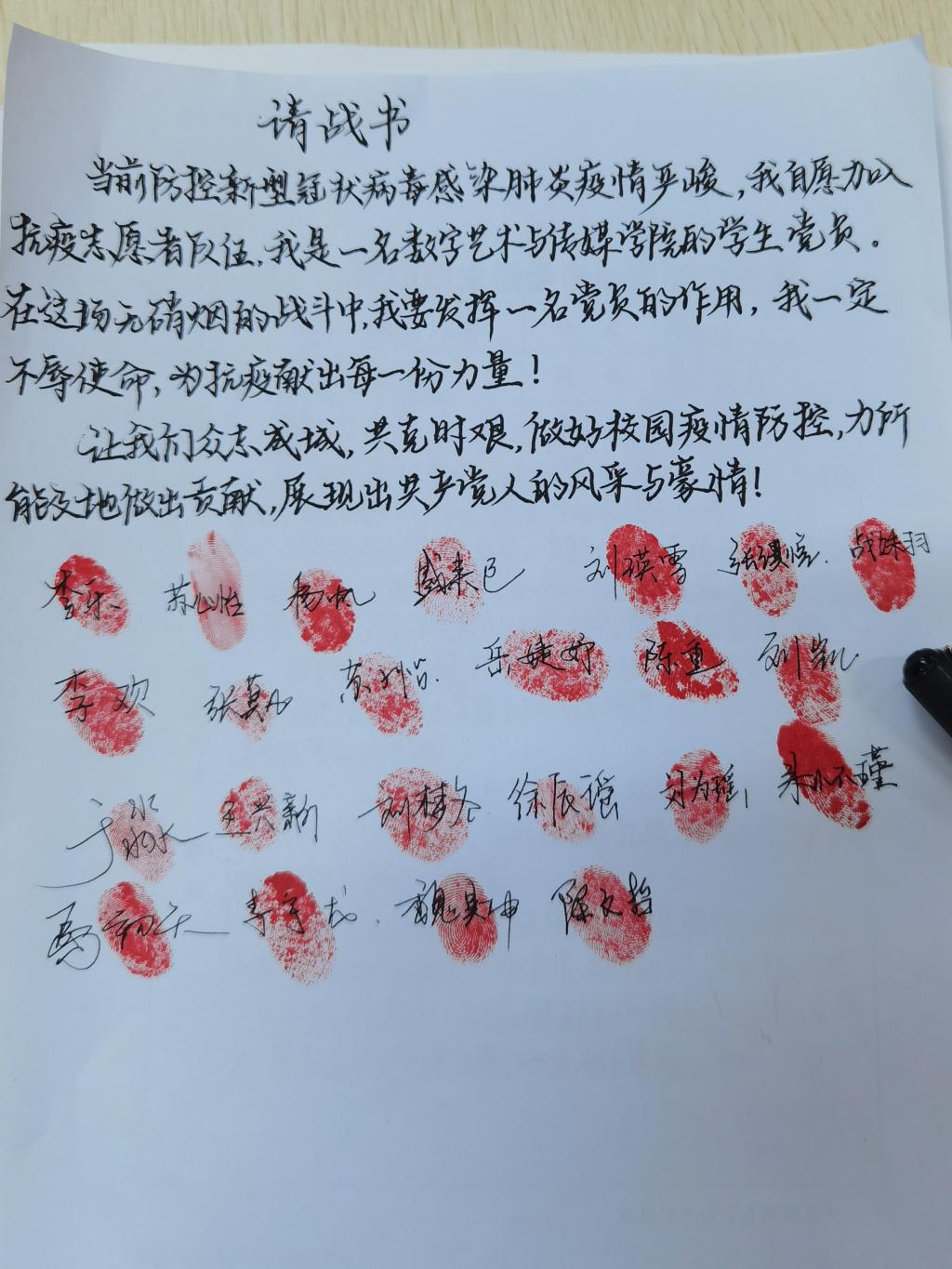 黑色的字迹是坚定的决心,红色的手印是赤诚的真心,一封封印着红手印的“抗疫请战书”,在疫情防控的关键时刻,体现着坚守与担当,承载着学生党员们抗击疫情的决心和信心。数字艺术与传媒学院学生第一、第二党支部将组织全体党员志愿者,在校园内开展疫情防护和安全稳定工作。