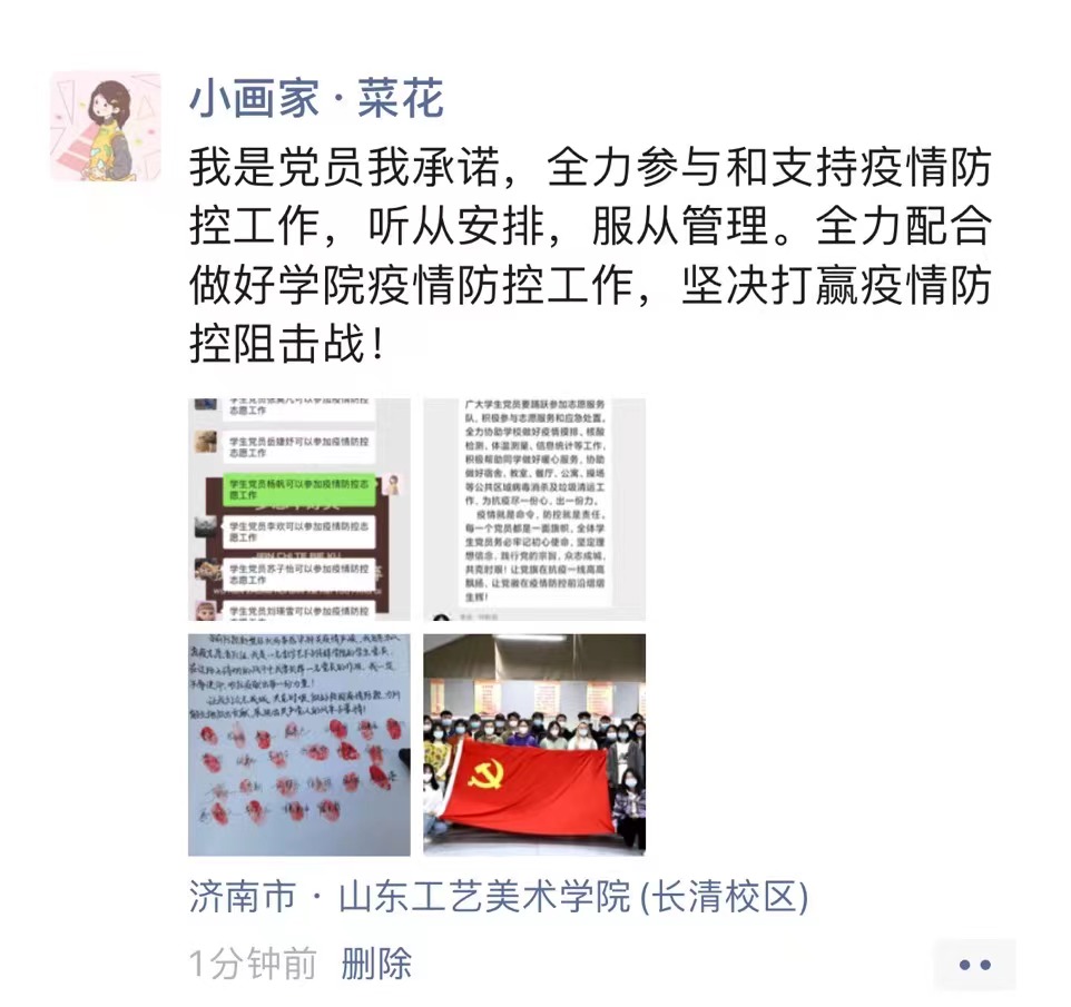 疫情就是命令,防控就是责任。近日,面对山东省地级市的新冠肺炎疫情,在全校师生齐心协力、共渡难关的关键时刻,数字艺术与传媒学院在校党员使命在身,积极发挥党员先锋模范作用,主动递交请战书,请战成为战“疫”的“先锋军”。