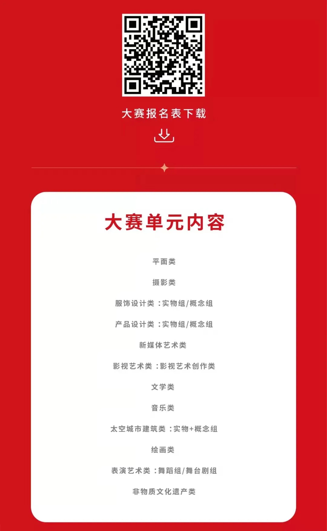 赛事涉及平面、摄影、服饰设计、产品设计、新媒体艺术、绘画、太空城市建筑、影视艺术、音乐、文学、表演艺术、非物质文化遗产类等12个比赛单元,面向全球广泛征集作品。