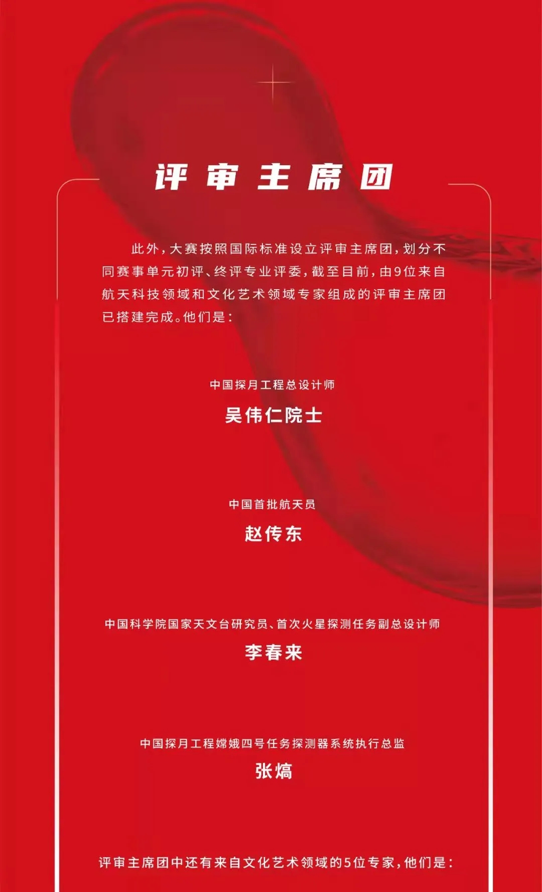大赛评委会按照国际标准设立评审主席团,不同赛事单元划分初评、终评专业评委。评审主席团由航天科技工作者、文化艺术工作者共同组成: