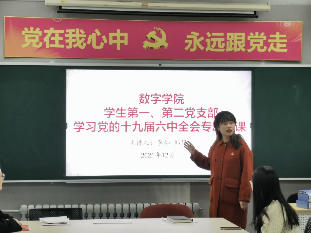 为深入学习贯彻党的十九届六中全会精神,数字艺术与传媒学院学生第一、第二党支部于12月13日下午,在B446开展学习党的十九届六中全会专题党课。学生第一、第二党支部书记李灿、郑静主讲,学生第一、第二支部全体党员参加会议。