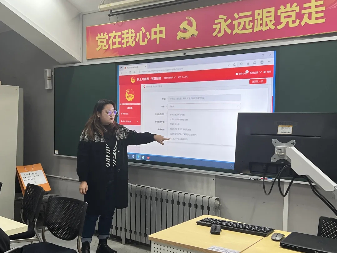 最后,李灿老师就近期团委下达的工作内容进行了部署安排。第一,要求各支部团支书严格按照流程开展专题组织生活会,将会议流程、评议步骤以及评议结果等内容及时录入智慧团建系统。第二,对团支部对标定级进行了讲解,要求各支部团支书积极筹备述职评议、开展支部自评。第三,她提醒各班团支书要及时在智慧团建团内激励板块中录入相关内容,做好线上平台建设。会后,团总支组织委员苏晓芳梓同学组织各班团支书就智慧团建录入方法和注意事项作了详细的说明。