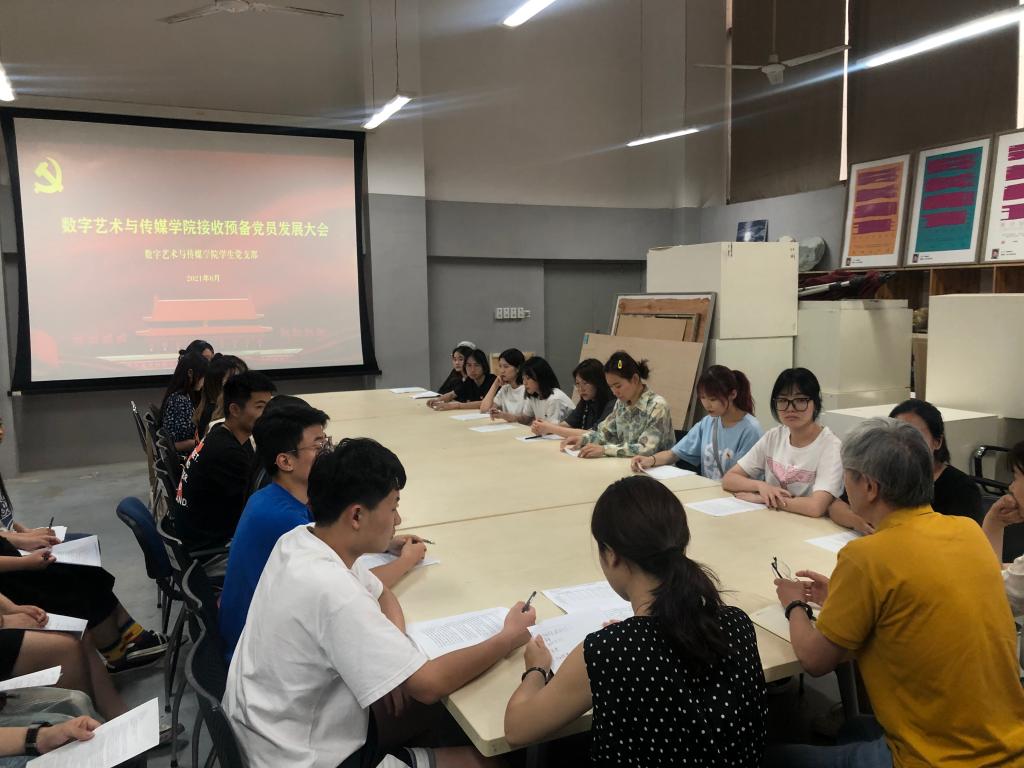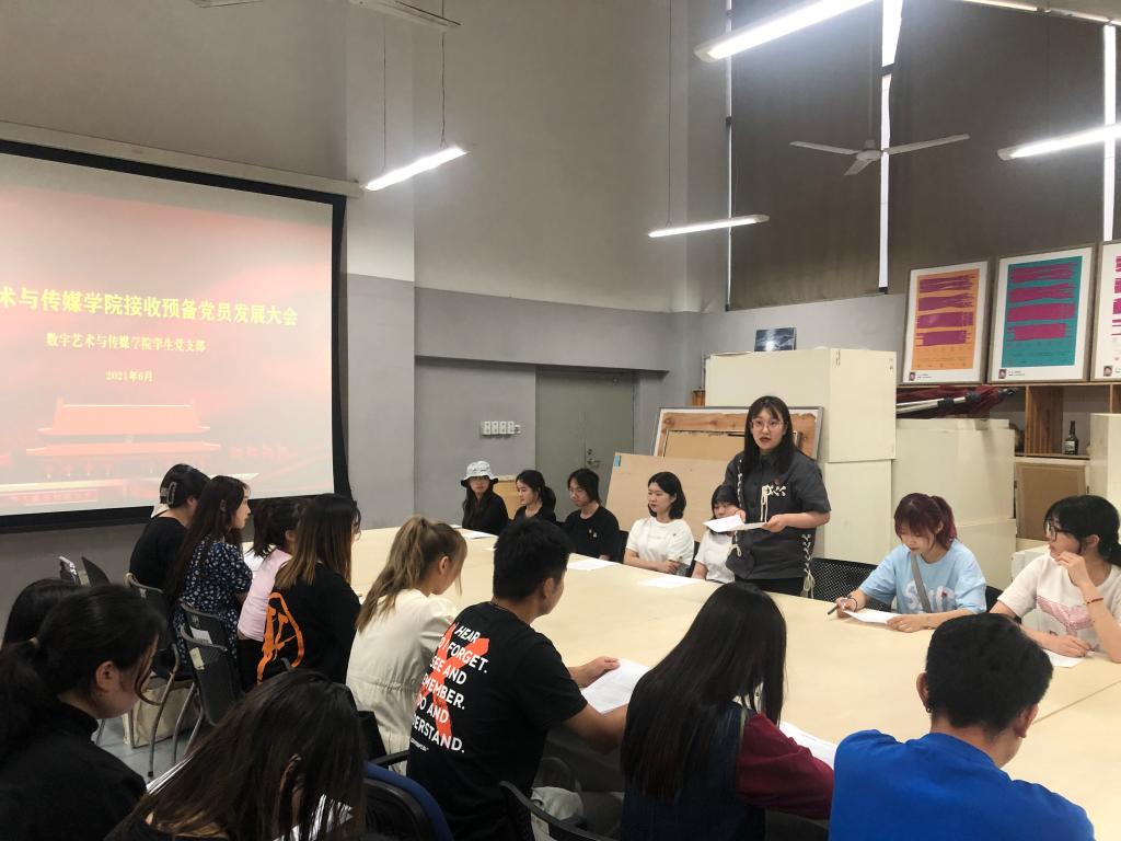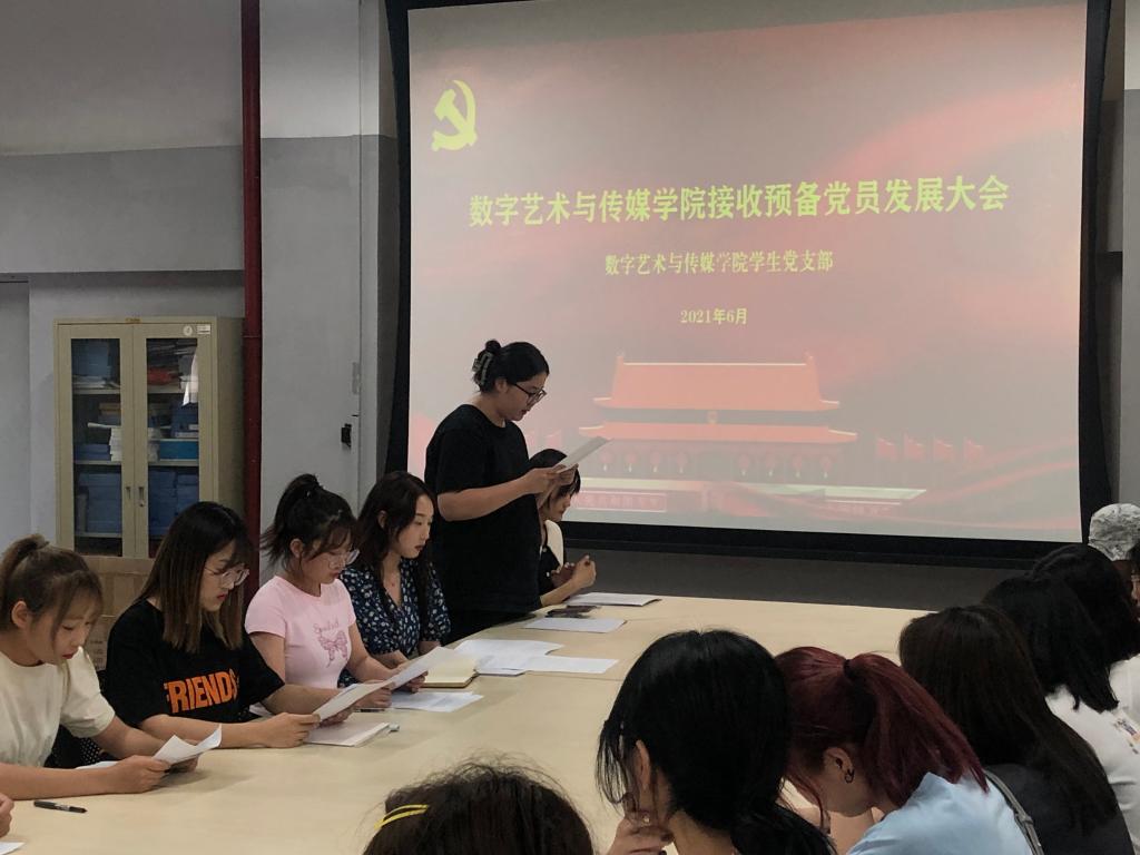 6月21日下午,数字艺术与传媒学院学生第一、第二党支部在多媒体会议室B446召开预备党员接收大会。数字艺术与传媒学院党总支书记丁鲁、学生第一党支部书记李灿、学生第二党支部书记郑静和数字艺术与传媒学院学生支部全体党员、预备党员、党员发展对象参加会议。