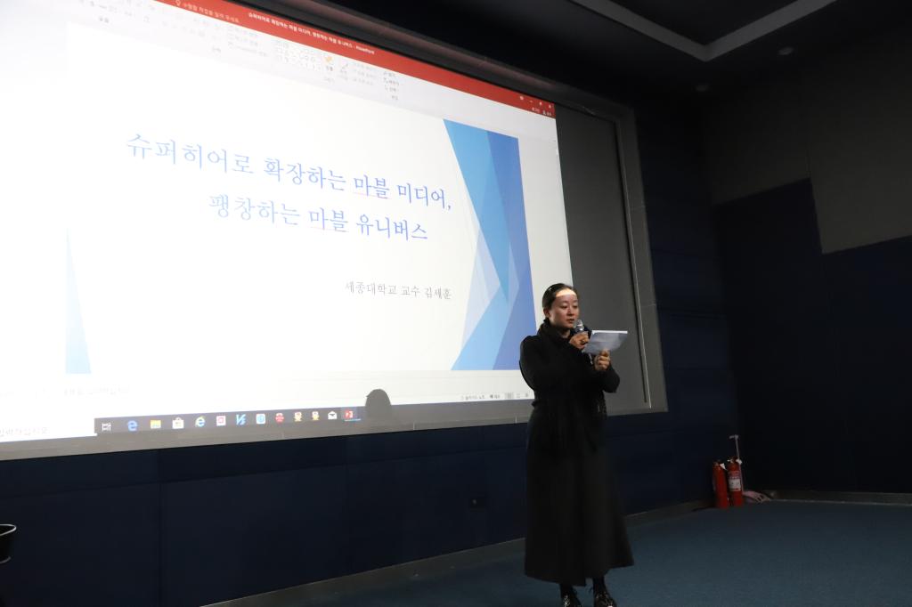 2019年11月21日与22日两天时间,韩国世宗大学的金世勳教授与文炫善教授来我院进行学术交流,交流活动包括一场座谈会和两场学术讲座。讲座分别以“超级英雄电影类型的特点和跨媒介叙事战略”与“韩国学者视野中的中国电影”为题,由数字艺术与传媒学院副院长高小燕主持,数字艺术与传媒学院戏剧影视美术、影视摄影与制作、广播电视编导专业的部分师生参加了两场讲座。