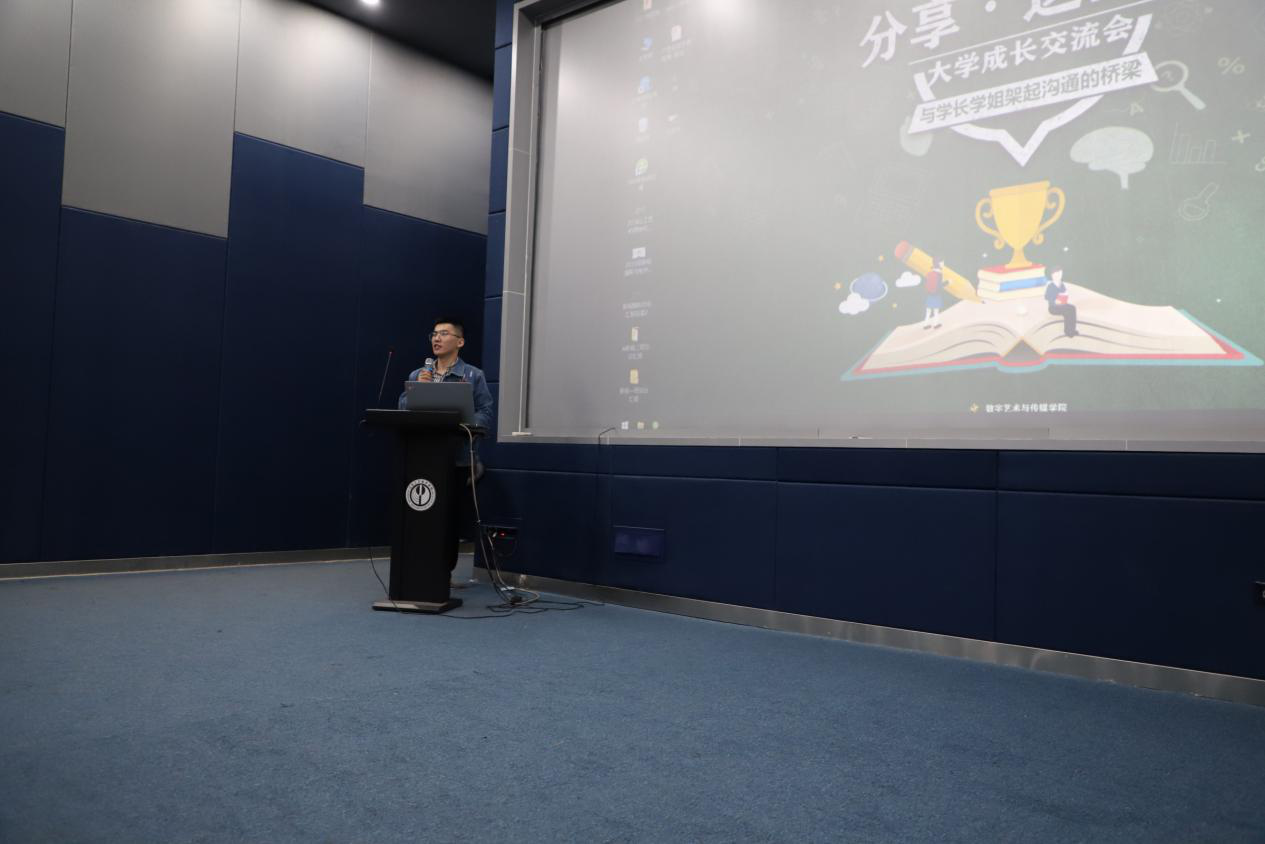 4月3日下午三点,数字艺术与传媒学院在数字演播厅二楼举行了“分享·这四年”大学成长交流会。院长顾群业、党总支书记丁鲁、副书记李清华、辅导员林忠鹏、李灿出席活动,学院大一新生参加此次交流。