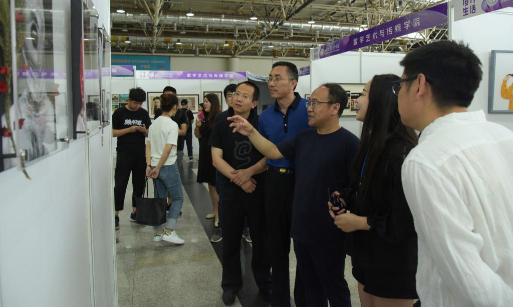 5月19日上午,副院长董占军、韩世春参观设计艺术博览会。参观过程中,董占军、韩世春认真听取数字艺术与传媒学院院长顾群业和各指导教师对作品整体情况的介绍,与毕业学生探讨作品的创作理念,并对数字艺术与传媒学院在毕业设计环节所做的工作给予充分肯定,认为学生作品紧密结合社会生活,充分体现出我校所提倡的设计为人民服务的艺术追求和人文情怀,并结合展出作品对毕业展及我校教育教学改革工作提出具体要求。