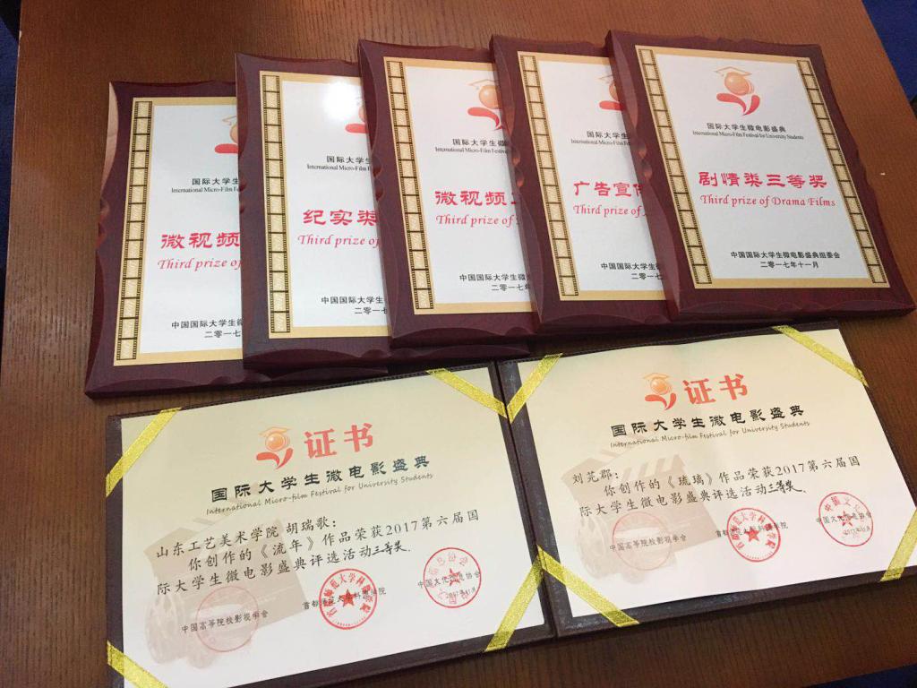 第六届国际大学生微电影盛典颁奖典礼于11月18日晚在首都师范大学科德学院本部礼堂落幕。我校数字艺术与传媒学院五部作品经评审委员会评选入围终评并斩获各竞赛单元的奖项。其中,于雨琳导演的《半大脑壳》获得剧情类三等奖,苏含敏、汪文静创作的《疯狂马戏团》获得广告宣传类三等奖,刘芫郡编导的《琉璃》获得纪实类三等奖,胡瑞歌的《流年》和项琴的《父亲》获得微视频类三等奖。