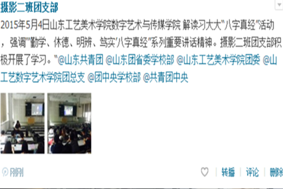 为了开展中国梦学习宣传教育及培育和践行社会主义核心价值观,践行总书记提出的“勤学、修德、明辨、笃实”的重要要求,数字艺术与传媒学院在“五四”期间集中开展一次“如何练好习近平传授的‘八字真经’”主题团日活动。本次活动由我院团总支书记孙明、辅导员张运春共同主持,2012、2013、2014级团支部和入党积极分子积极参与活动。