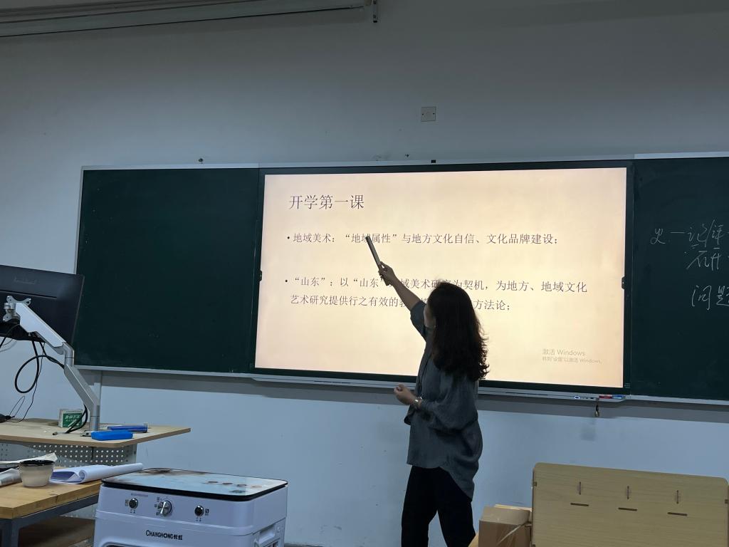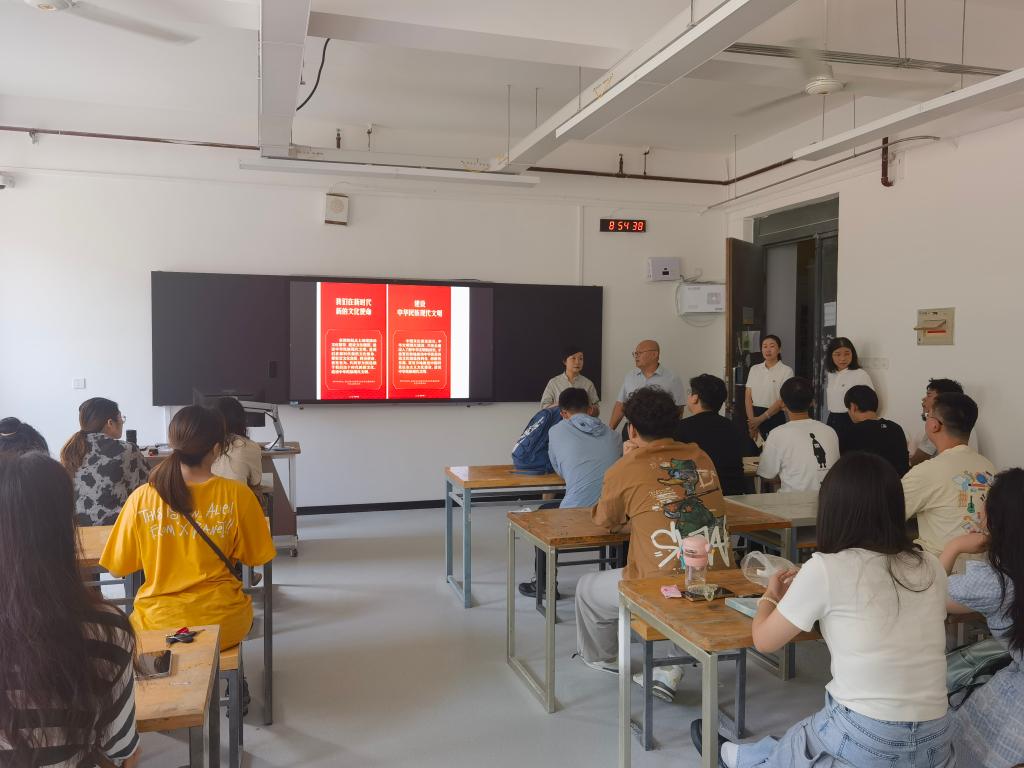 人文艺术学院邵艳芬老师的开学第一课《“以学增智”内涵在专业理论课程中的应用》用习近平总书记提出的“提升政治能力、提升思维能力、提升实践能力”鼓励大家,叮嘱学生自强自信、守正创新,学好看家本领,为全面建设社会主义现代化国家、全面推进中华民族伟大复兴而团结奋斗。荣新老师以习近平总书记在文化传承发展座谈会上的讲话为出发点,结合《传统造物研究》课程的授课内容,从传统造物的视角进一步阐发了总书记概括提出的中华文明具有突出的连续性、创新性、统一性、包容性、和平性的五个特性,鼓励同学们坚持守正创新,勇于担当使命,走好优秀传统文化创造性转化、创新性发展的道路,为建设中华民族现代文明作出贡献。王璟老师从以视觉创制塑造国家文化形象、以艺术力量助力实现精神共富、以人才禀赋赋能社会美育三个方面,分析艺术设计在中国式现代化进程中的重要作用。帮助学生理解艺术以独具魅力的跨文化性语言,向世界展示以“中国精神、中国气派、中国风格”为核心、传统与当代相兼容的中国文化形象。彭鹏老师以乡村振兴为主题,结合泰山黄家峪小米推广方案(调研、策划、包装设计、视频宣传等)及万德街道乡村文旅深度融合方案,鼓励学生发挥自己的策划、创意、设计才能,彰显广告学专业社会服务的能力和实战技能应用水平。