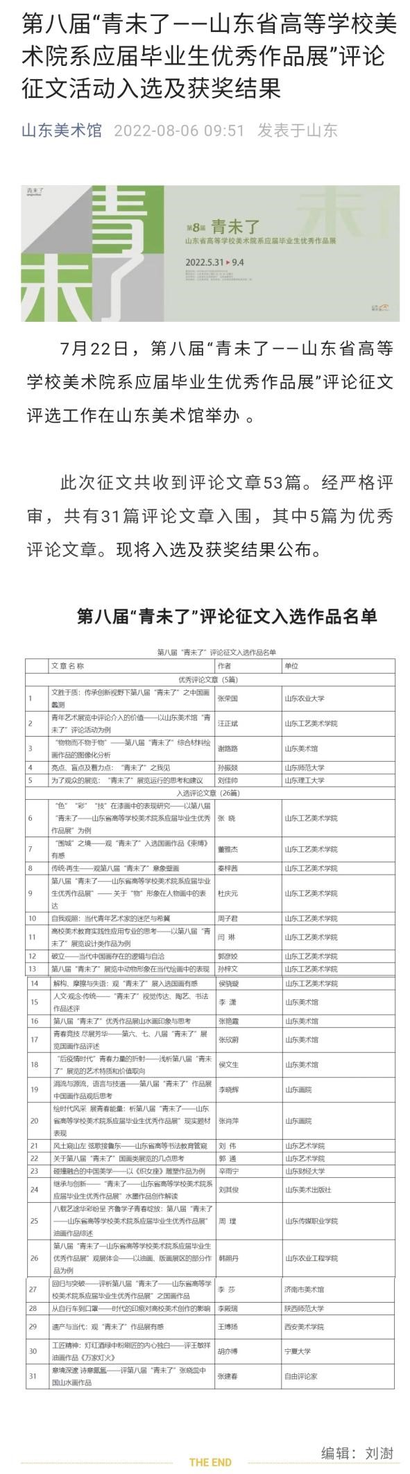 此次征文共收到评论文章53篇。经严格评审,共有31篇评论文章入围,其中5篇为优秀评论文章。我院美术学专业学生10篇评论文章入围,并且1篇文章入选优秀评论文章。从入选的评论文章来看,既有学术概念的梳理,也有批评思想的阐发,态度客观,观点多元与山东美术馆策划“青未了”展览品牌的初衷不谋而合。本次人文艺术学院美术学专业学生汪正斌获得了优秀评论文章,也是5篇优秀文章作者中唯一的本科在校生。