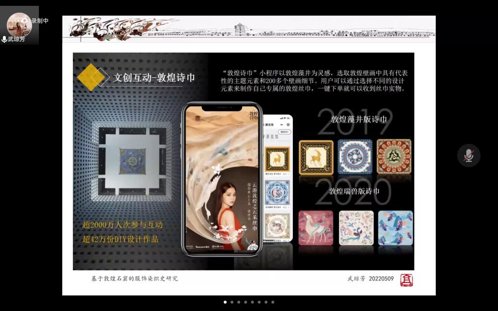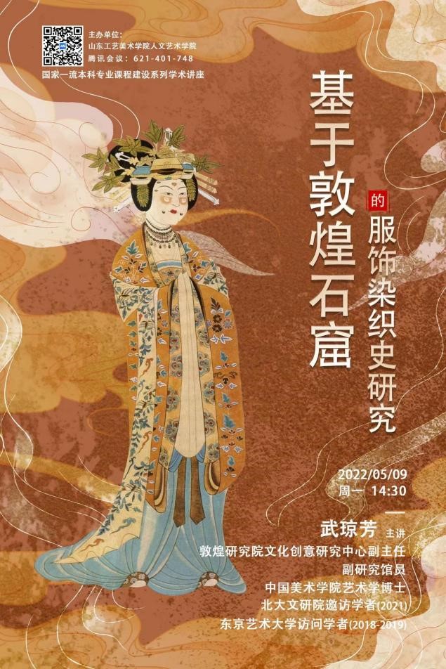 2022年5月9日下午,根据活动进度安排,我院如期举型了第二场线上讲座。本场讲座邀请敦煌研究院文化创意研究中心副主任、艺术学博士、东京艺术大学访问学者、北京大学人文社会科学研究院邀访学者武琼芳做了题为《基于敦煌石窟的服饰染织史研究》的讲座。