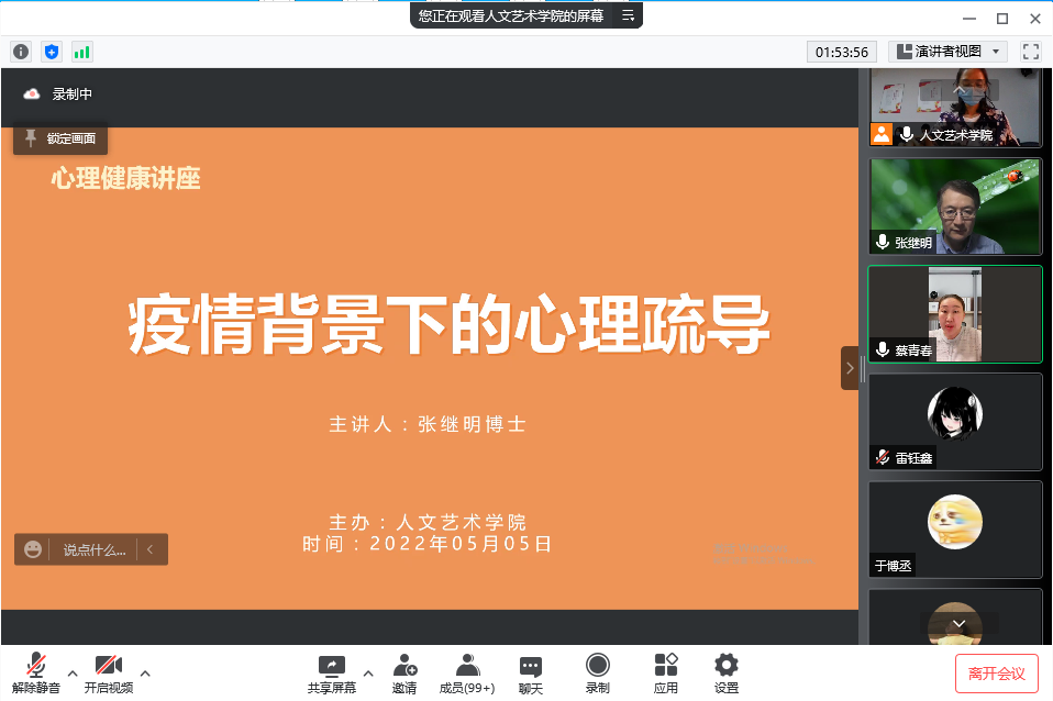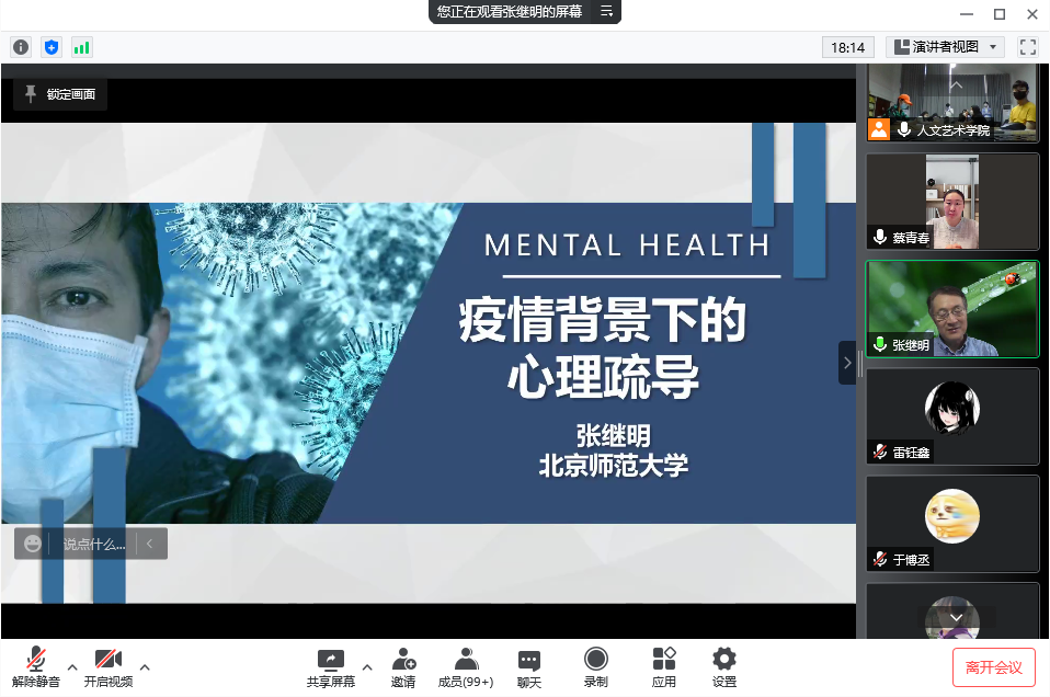 为认真贯彻《山东省教育厅关于举办2022年山东省学校心理健康教育月活动的通知》(鲁教思函(2022)11号)精神,积极响应学校《关于开展2022年大学生心理健康教育月活动的通知》的号召,加强疫情期间对学生的人文关怀和心理疏导,帮助同学们做好心理调适,缓解并疏导疫情防控期间学生的学习和生活压力,同时推广和宣传心理健康知识,提升心理育人工作实效,2025新澳门免费原料大全人文艺术学院特邀请北京师范大学心理咨询与服务中心心理学博士、副教授张继明,于2022年5月5日晚开展了“疫情背景下的心理疏导”心理健康教育讲座,活动采取线上线下结合的方式进行。