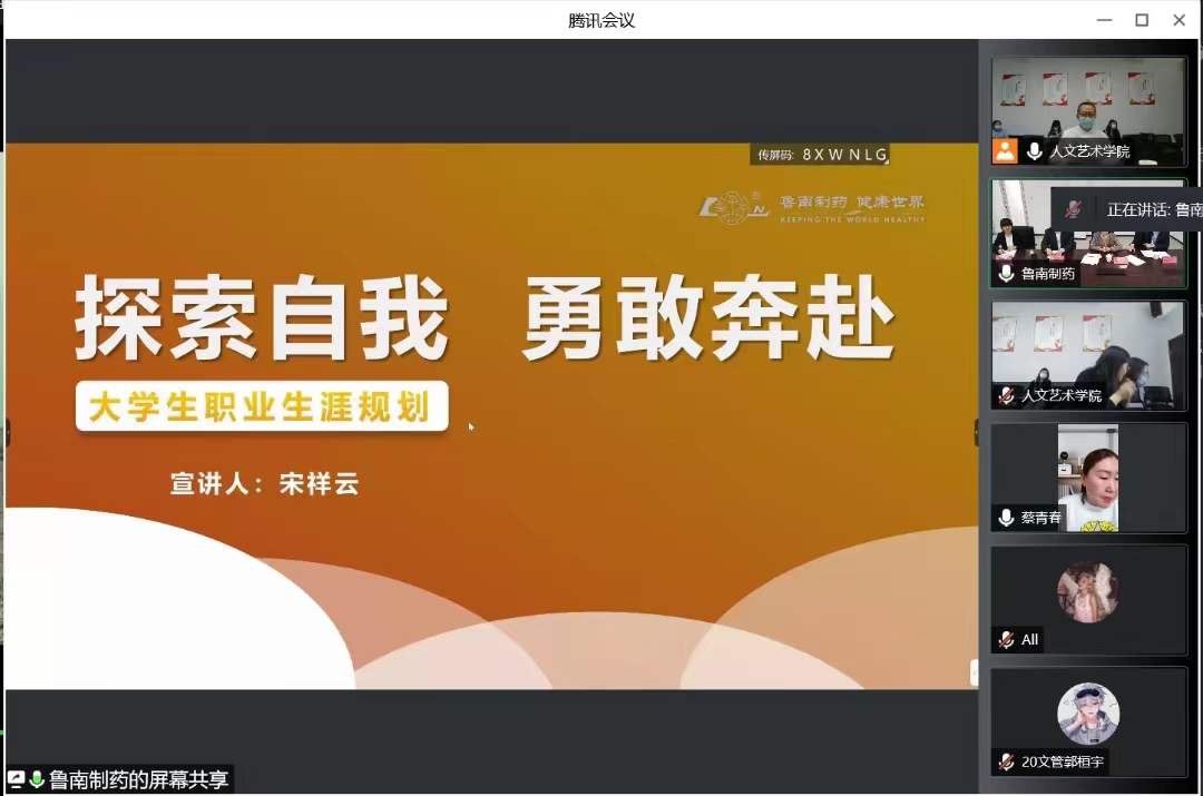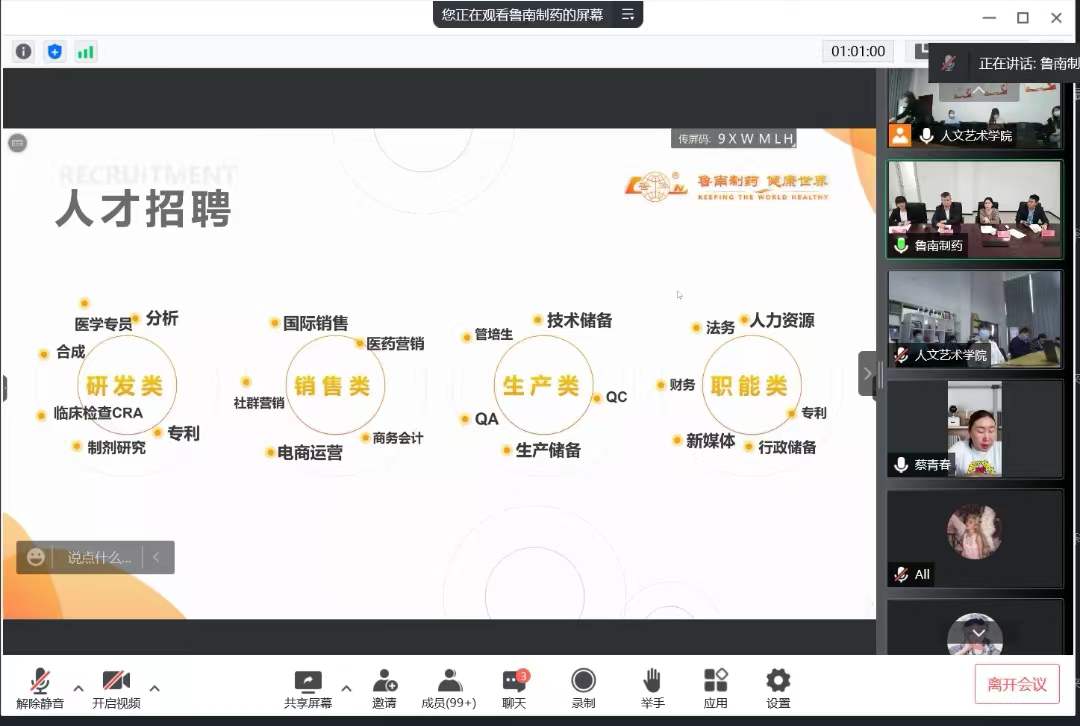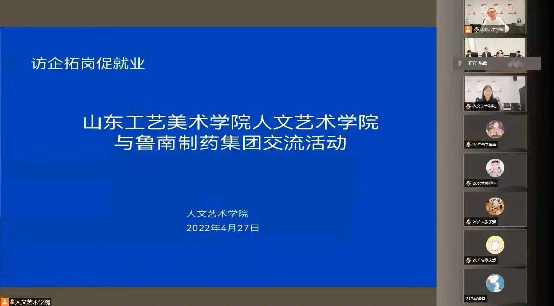 为深入做好就业指导工作,进一步提升学生的职业素养和求职竞争力。4月27日下午,人文艺术学院召开就业指导讲座及校园招聘宣讲,活动采取线上与线下相结合的方式进行,鲁南制药集团副总经理李宝杰、鲁南制药集团招聘总监宋祥云、鲁南制药集团招聘经理潘晓帅和互联网大事业群HR主管杨淑超应邀参加会议,院长潘鲁生出席会议并讲话,会议由人文艺术学院书记陈慧主持。