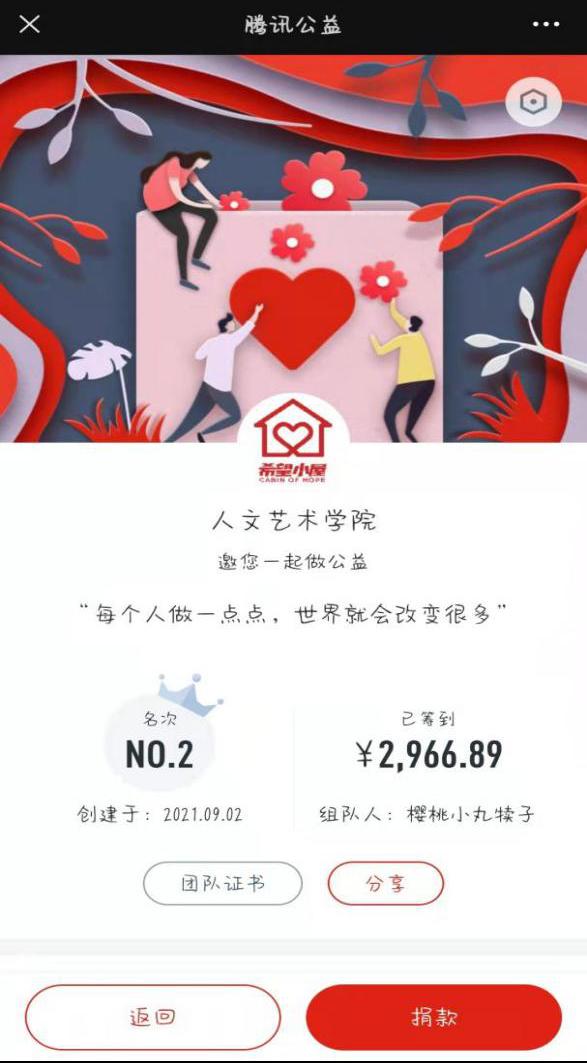 本次公益活动借助腾讯微信公众号平台发起,捐助时间为2021年9月7日至9日。在学院团总支的大力推动下,学院师生广泛参与,纷纷贡献爱心。截止9月9日24时,人文艺术学院战队共筹集善款2966.89元,位列我校“希望小屋”筹集善款排行榜第二名,助捐善款将全部用于山东省“希望小屋”建设及后续志愿服务工作。