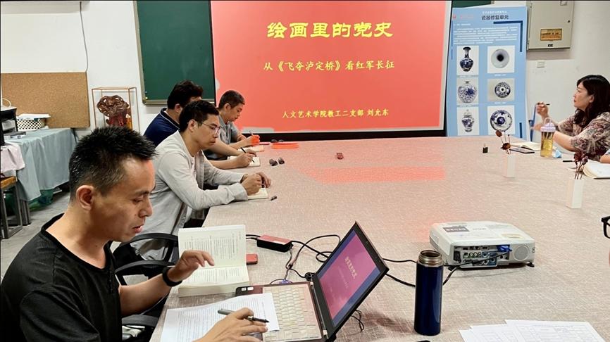 党总支委员、教工二支部组织委员刘允东为支部全体党员讲授《绘画里的党史》专题党课。从刘国枢的油画作品《飞夺泸定桥》谈起,介绍了这幅作品的创作背景和创作过程,阐述了红军的长征过程及其伟大的历史意义。