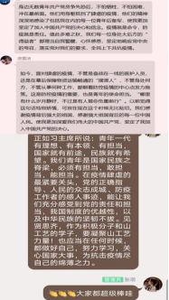 18级艺术史论团支部围绕总书记在疫情防控中体现负责任大国担当的重要讲话精神开展了本次主题团日活动.团支书在班级QQ群带领支部成员学习“习近平总书记给北京大学援鄂医疗队全体“90后”党员回信”的内容. 同学们分享了自己在疫情期间感触最深的的事情,并认真思考了在国家需要的时候,自己抱有的态度和能做出什么贡献的问题。最后,讨论在意犹未尽中结束。作为当代青年,应于疫情中见贤思齐焉,用实际行动为坚决打赢疫情防控人民战贡献自己的青春力量!