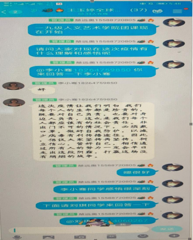 为深入学习贯彻习近平总书记对当前疫情系列重要指示精神和党中央、国务院决策部署,按照学校党委和上级团组织工作要求,人文艺术学院团总支组织开展了一次线上主题团日活动,各年级团组织通过企业微信APP、QQ群等多种方式,围绕“重温中国共青团知识”、“青春抗疫,从我做起”、“我的专业能为抗疫做什么”等主题,为争取防控斗争胜利贡献青春力量。本次活动由各班团支部书记主持,全体共青团员积极参加。
