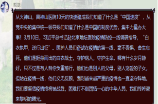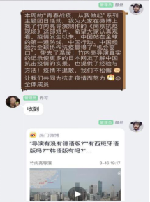 19级文化产业管理班由团支书毕经纬主持了此次的活动,在团课活动期间,团支书毕经纬向大家分享了疫情防控的视频短片《三十三》,视频《三十三》是知乎拍摄发布的抗击疫情的短片,记录了庚子新年以来三十三天全国上下齐心协力抗击疫情的感人瞬间。看完短片后,蒋文宇班长认为是疫情让我们感受到了国人团结的力量和白衣天使以及众多各行各业的志愿者们无私的付出带来的感动,我们应该向他们学习,为强大的祖国尽自己的一份力。