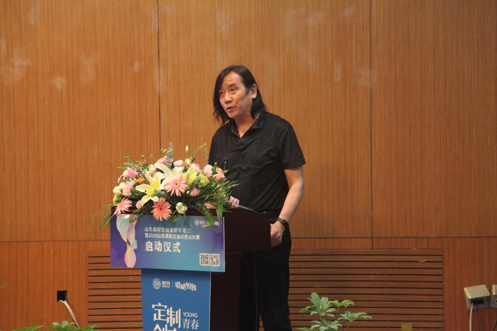 山东高校轻创业联盟成员代表、人文艺术学院党总支书记安峰发言。他表示,联盟的成立和大赛的举办为学生创新创业打造了一个实战平台,今后要打造好、发展好这个平台。作为联盟成员单位,今后要不断总结推广创新创业工作经验,拓展创新创业服务内容。