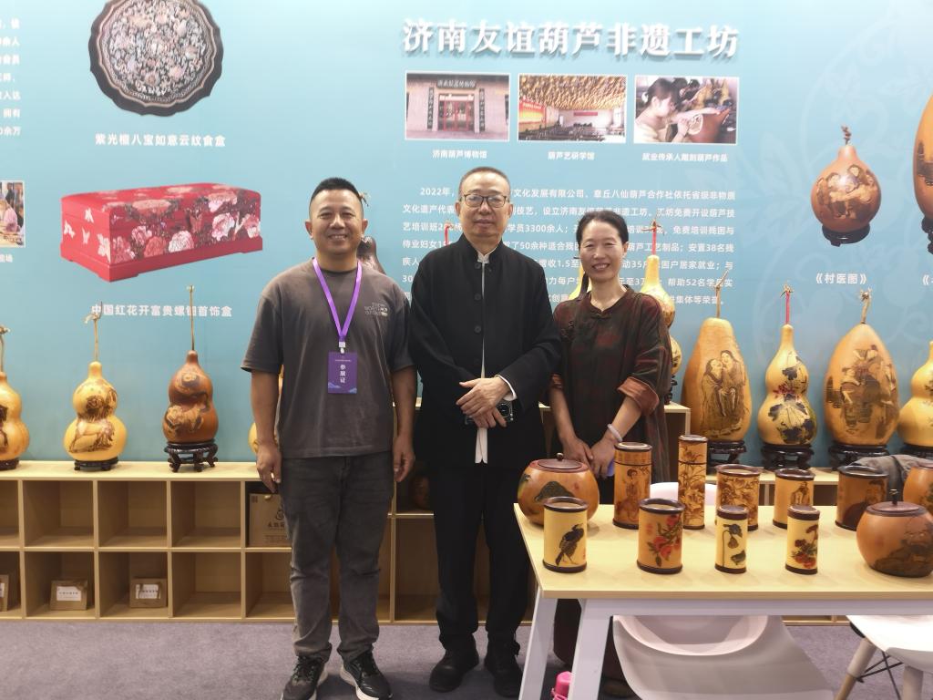 在国家级非遗工坊展区,来自我院第六期研培班的马友谊作为典型案例参与展览,友谊葫芦工坊长期致力于章丘传统葫芦雕刻技艺的传承保护,为乡村振兴作出了显著贡献。