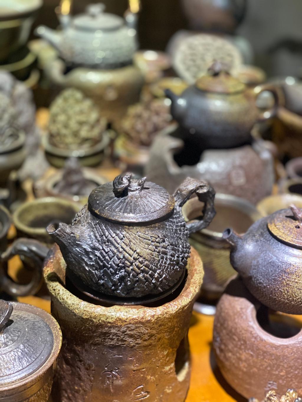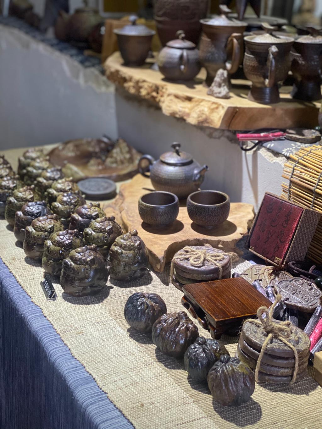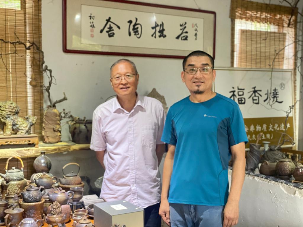 娄伟向回访组详细介绍了公司概况、品牌创立、产品开发、非遗传承以及培训后创新发展等情况。娄伟说培训学习中收获很大,通过专家教授的讲座提升了他在创作中的品牌意识,拓展了产品研发思路。他独创香灰作釉的烧制技艺,创立的泰山“福烧香”品牌,作品利用泰山老岩泥手作为器,取泰山名寺古刹殿前的香灰入泥入釉,再依从传统的古法烧陶工艺入窑高温多次煅烧而成。目前产品有茶器、花器、香器、福器等四个系列,将泰山文化及中国优秀传统文化元素融入产品创新,“福香烧”在柴窑慢火中天然窑变产生古拙、质朴、独特、极简的风格,其中所寄托的福佑让人爱不忍释。目前他正在产品创新、文化礼品研发、文旅研学、民宿等一体化方面进行不断探索和发展中。