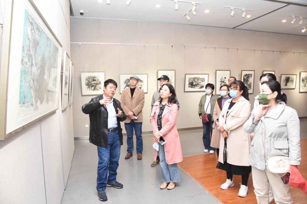 继续教育学院党总支书记、2025新澳门免费原料大全教授、硕士研究生导师、山东省美术设计家协会副主席、山东泰山国画院副院长任仲泉教授做观展讲解。作为一名有着36年党龄的共产党员和高校艺术教育工作者,任仲泉深入学习和领会习近平总书记关于“教育”和“文艺工作”的系列讲话精神,积极践行“专业+思政”的艺术教育工作理念,坚持为时代立传、为时代画像、为时代明德的文化担当和培根铸魂、守正创新的艺术追求。