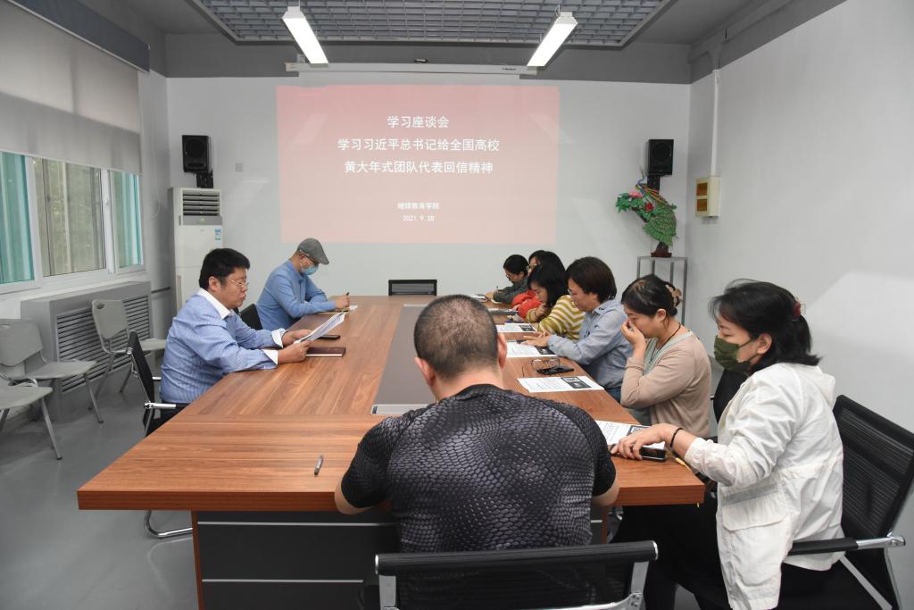 根据学校《关于学习贯彻习近平总书记给全国高校黄大年式教师团队代表重要回信精神的通知》要求,继续教育学院制定相关学习方案,积极落实学习精神。结合工作实际,组织开展多种形式的学习研究阐释活动。并于2021年9月28日组织召开座谈会,全体教师参加。