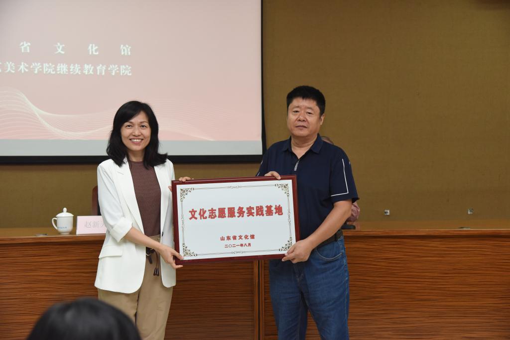 为充分发挥“优势互补、资源共享、互惠互赢、共同发展”的原则,实现志愿者服务与美术教学实践等方面开展共同合作,继续教育学院切实为群众、为师生办实事,不断增强群众、师生的获得感与幸福感,与山东省文化馆扎实开展“我为群众办实事”主题实践活动。2021年9月14日上午,继续教育学院与山东省文化馆实践基地双向揭牌仪在山东省文化馆举办。山东省文化馆副馆长赵新天、山东省文化馆美术摄影部主任王竞艺、继续教育学院党总支书记任仲全、社区艺术大学常务副校长王传东及部分师生参加揭牌仪式。