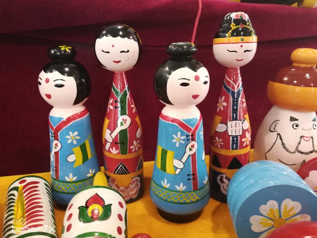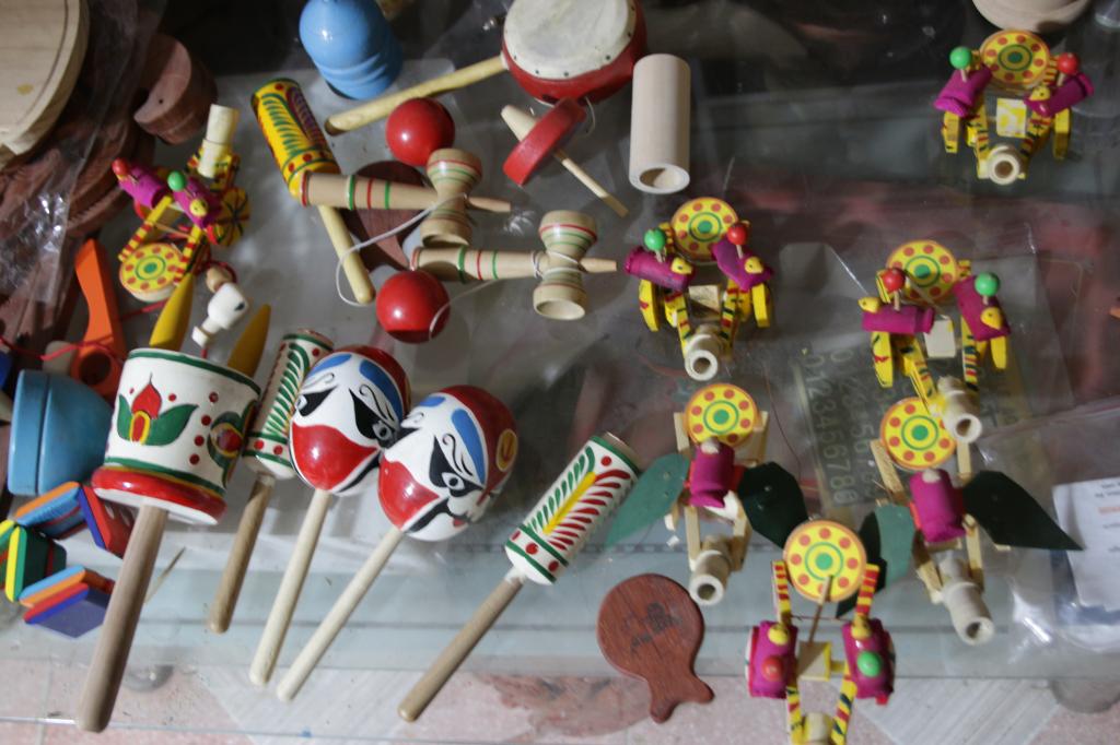 在樊来生的引导下,我们来到了国家级非物质文化遗产代表性项目传承人樊继美的家中,樊老先生向我们介绍了展架上陈列着品种众多的木旋玩具和正在制作中的玩具。有哗啦棒槌、虎头棒槌、拨浪鼓、小燕车、击鼓车、刀枪、棒槌、高低棒棒人、不倒翁、陀螺等。每一种木旋玩具的独特造型、鲜艳色彩、富有寓意的图案、清脆声响和美妙的动态共同呈现出一个独特而完整的作品,赏心悦目,令人喜爱。目前村里仅有樊继美一家从事种类比较齐全的传统木旋玩具的传承与制作。