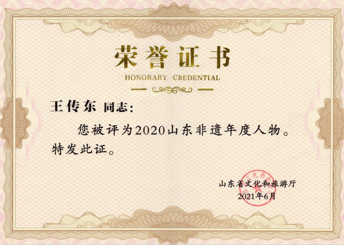 我校社区艺术大学常务副校长王传东教授(原继续教育学院院长)在非遗传承与保护、传统工艺创新设计、齐鲁优秀传统文化的创造性转化、创新性发展等方面做了大量工作,尤其是在非遗培训人才培养、活动组织、工作站建设、培训成果转化、文创产品研发、非遗知识普及推广等方面成绩突出,经省厅组织专家评审,获评“2020山东非遗年度人物”。