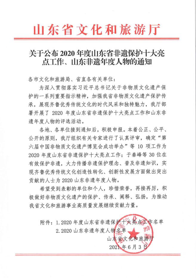 为深入贯彻落实习近平总书记关于非物质文化遗产保护的一系列重要指示精神,加强我省非物质文化遗产保护传承,展现齐鲁优秀传统文化的时代风采和独特魅力,省文化和旅游厅部署开展了“2020山东非遗年度人物”的评选活动。