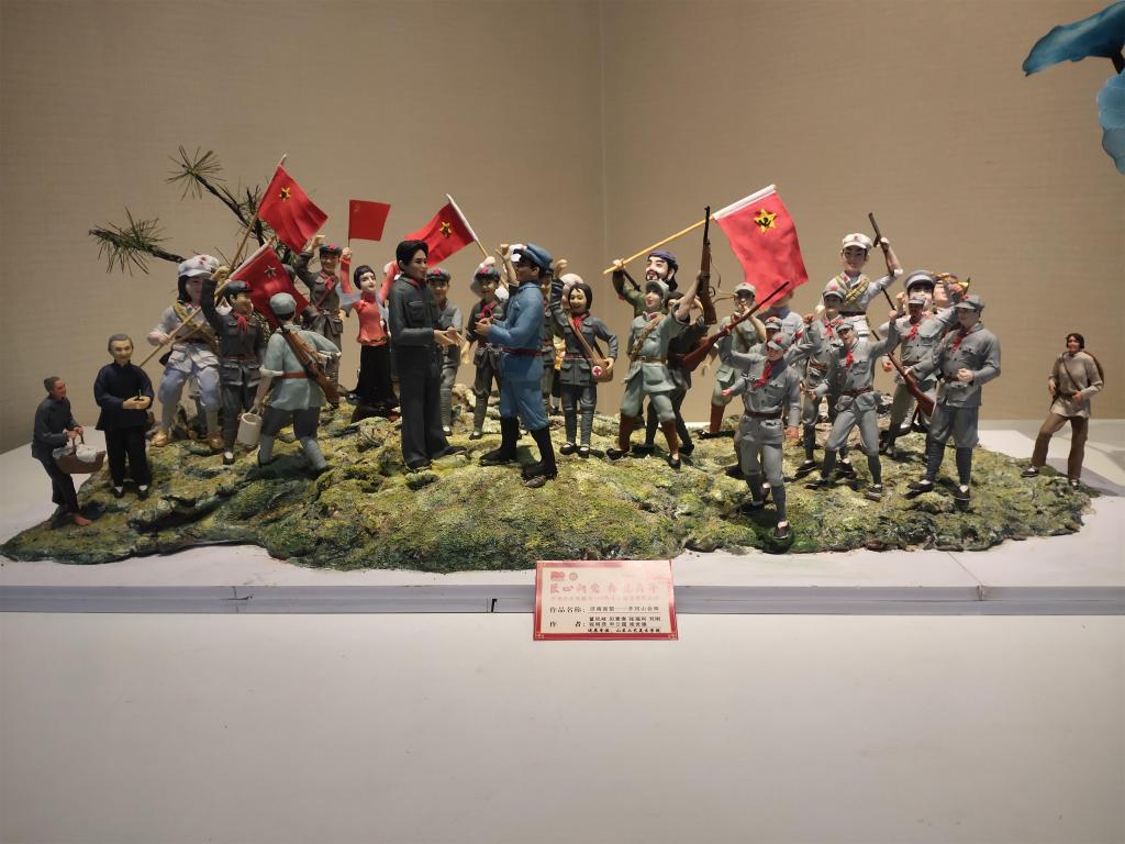 由我校研培基地授课教师面塑大师董凤岐教授带领非遗班学员申兰霆、张世建及其弟子张明彦等7人创作完成的大型主题面塑作品“井冈山会师”于12日在济南市文化馆展出。