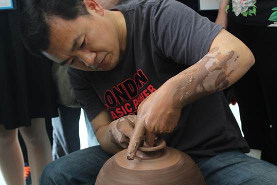 下午,李闻雷给大家现场演示和讲授了陶泥拉坯工艺的技术要点和方法,并且将自己多年摸索创造的饰面技巧等无私地向学员们进行了传授。