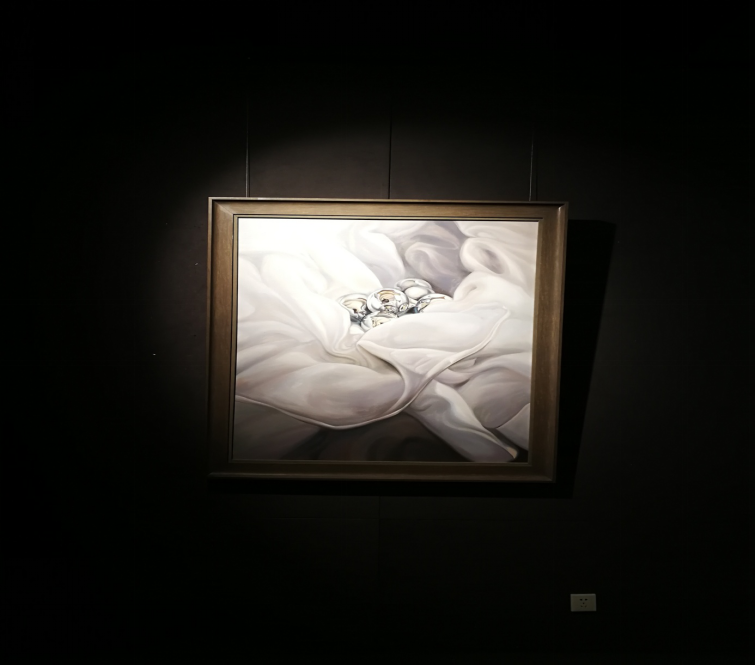 读过朱红梅创作感言,方知她虽浸于传统,却不安于传统,虽以西画呈之于众,却得自身文脉之滋,养于心而流于笔,正是切合前人不断探究中西的融合,践行传统与当代如何实现绘画语言的转换,此为中国艺术家可为之着力探索之道。她参与父女三人的联展取名《无界 无尘》,解其意,可谓:无界为用,无尘为心。无界,可谓跨界,可谓不拘于理法,不拘于中西艺术固有之框,以无界之立场与方法为我所用;无尘,可谓心无旁骛,非“无尘”,实则和光同尘,知白守黑也,对于为艺为人,心无尘,然后方有同尘之境界。原指三人联展之特色,更指其如一的艺术追求。