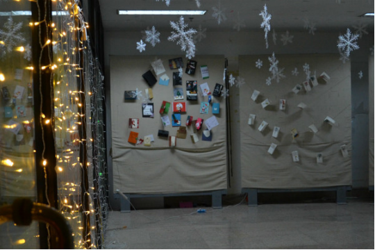 文化礼仪部成员提前将场地布置好,在七点钟全体成员到一楼大厅参与活动。精美的小礼品和光彩四射的彩灯将整个大厅装饰的美轮美奂,弥漫着圣诞节日的气氛。整个大厅人声鼎沸,热火朝天,每个人都兴致勃勃在每个贺卡前面认真观看,为自己喜欢的作品投上一票。