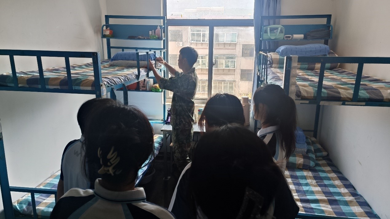 附中各年级学生在在军训教官的指导和班主任的带领下,结合学校宿舍整理规定,对宿舍各个位置进行了细致的打扫和整理。