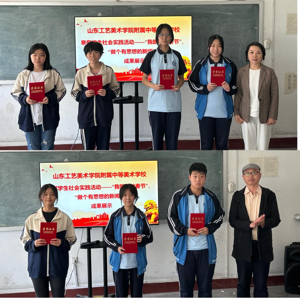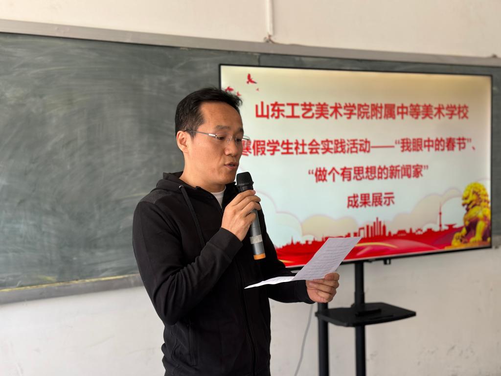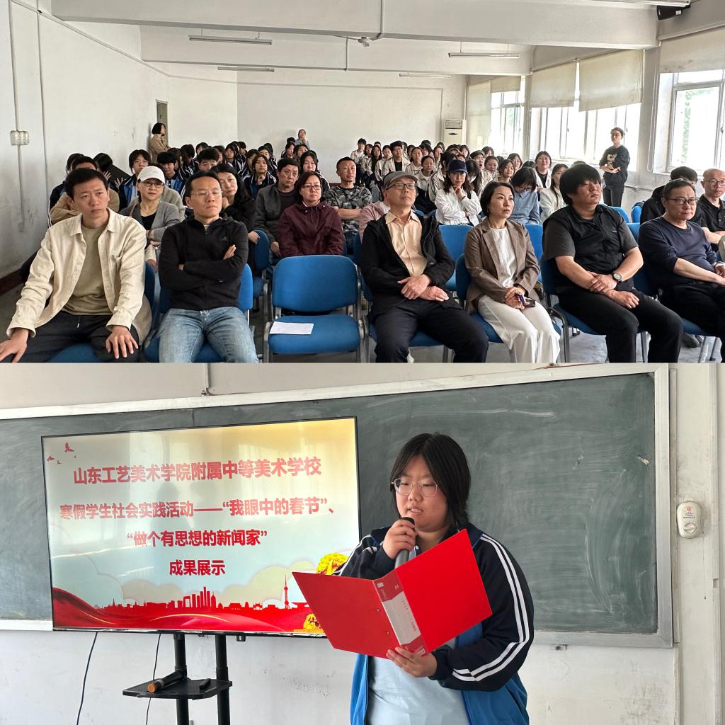 为提高学生综合素质,践行立德树人的教育宗旨,培养同学们感悟文化,观察美,表现美的能力,养成热爱生活、关心历史、关心时政的好习惯,寒假期间,附中组织了“我眼中的春节”和“做个有思想的新闻家”两项社会实践活动。4月24日下午,附中在教学楼402教室进行了寒假作品成果展示,附中校长耿玉、副校长孔大健出席,附中全校师生、家长代表参加活动。