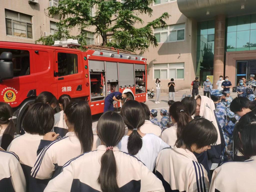 9月27日,附中在千佛山校区一号教学楼前开展“防火意识需谨记,安全常在莫大意”消防演练活动。初秋午后,骄阳尚未减退,附中高一同学已经整齐的站在教学楼前,专注地看着山东省消防大队历下分队的消防员讲解如何在烈火中逃生,并展开了宿舍内的消防演练与灭火展示。
