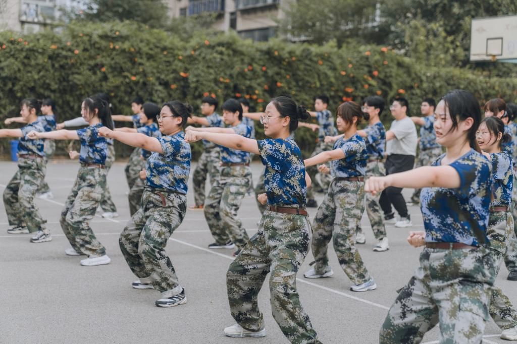 首先,附中全体高一新生军姿挺拔,步伐矫健,接连展示了队列操、拳术操、舞步操等受训内容,接受与会师生的检阅。他们坚定的步伐、整齐划一的队形、嘹亮的口号,彰显了2021级新生自强不息的精神面貌和青春激扬的蓬勃朝气。