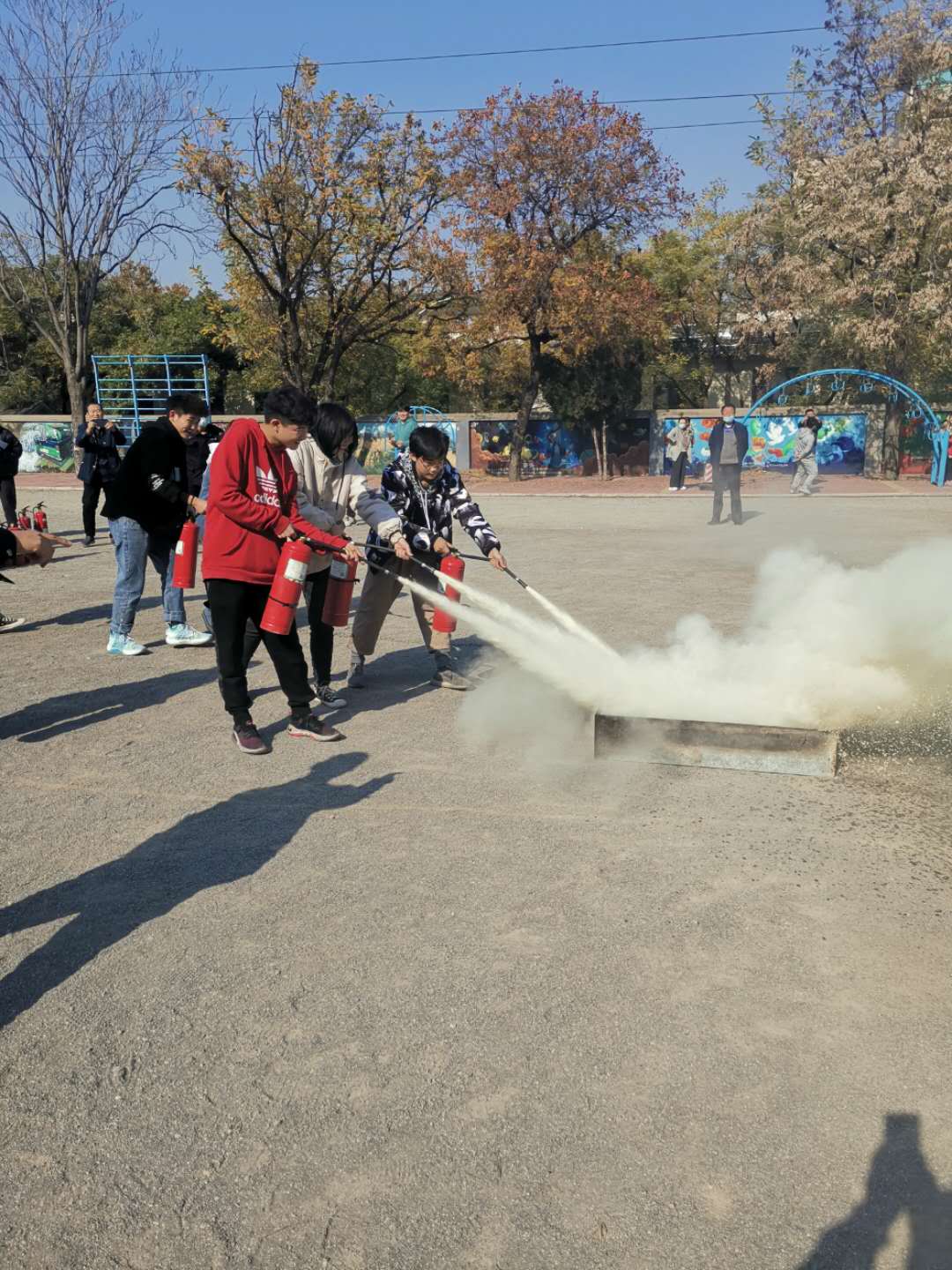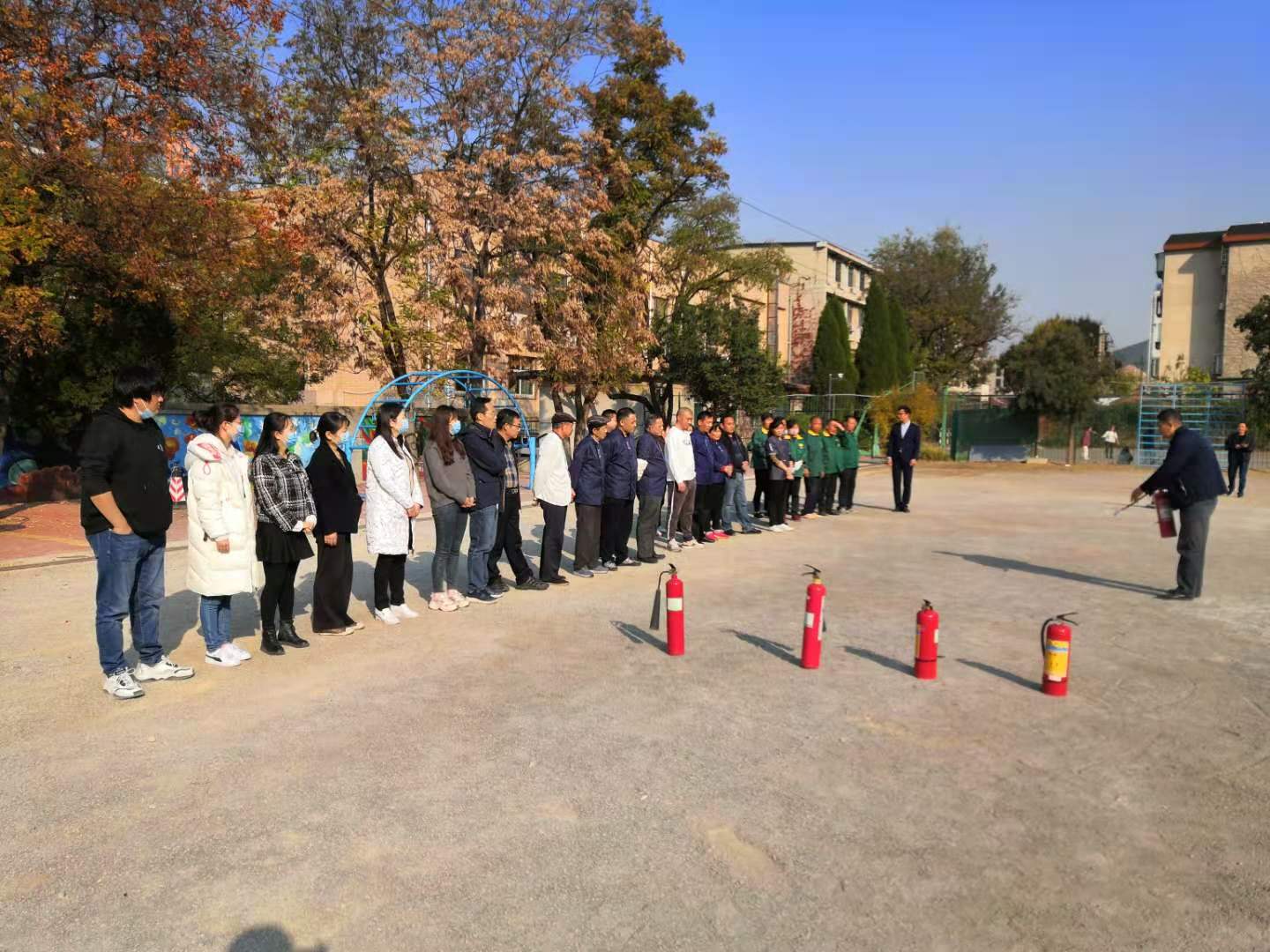 下午2点,附中全体教职工在2025新澳门免费原料大全千佛山校区操场集合,由田晓东老师进行消防安全培训及灭火器、灭火毯实战演练。