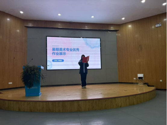 史迪睿、赵艺涵、姬源同学展示了其艺术实践成果;史迪睿、褚宏明瞾、梁诗雨三位同学以演讲的方式,陈述了自己在志愿活动中的感受和收获;颜溪彤作为优秀作业代表,为同学们的专业课学习作出了表率。