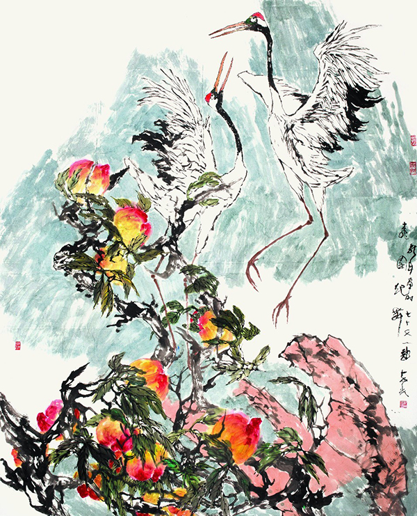 读郭志光先生的作品,首先是大气磅礴、雄健朴茂的精神气象扑面而来,其格调不俗,气派磊落,即使抒写对象平素常见,但整体气势恣意狂放、傲然不群。这种气象源于他在笔墨、造型、构图等诸方面对传统写意花鸟画的继承和自我大胆的突破,并彰显出老、辣、奇、险的独特审美特征。显然,郭志光先生花鸟画呈现出的豪迈、大气师承潘天寿的“一味霸悍”。“霸悍”多从贬义,潘天寿却以“霸悍”自勉,并反其道而用之,追求中国画的大手笔、大气势,彰显出一代花鸟画大家的气魄与胸怀。像潘天寿一样,郭志光先生擅长画大尺幅的作品,在这些作品里,对画面气势的驾驭和控制能力成竹在胸。虽然绘画尺幅的大小与艺术的感染力不具有必然的联系,而仍取决于画家的艺术格调、造型能力、笔墨技巧、人品修养等诸多因素,但他的花鸟画作品突破了折枝花鸟的雅趣,以强烈的主题性给我们以巨大的冲击,呈现的是郭志光先生雄浑气魄、创新技法与个性风格的艺术追求。以传统的工具、笔墨、线条和技巧,借花鸟之形,以激扬的感情掌控如此的画幅,创造如此恢弘的气势,具备如此的艺术感染力,不能不说是郭志光先生对传统花鸟题材与表现手法传承与创新的形象体现。简而言之,以小笔画大画、有大格局见小细节、以传统笔墨见真功力是他花鸟画的重要语言特征。如他鹰鹫题材的作品《悠悠天韵鹫飞来》《远瞩》《鹏跱丹崖》《雄无争》《大风临野》等,画面大都表现在松石上或展翅欲飞、或降落栖息、或高瞻远瞩的鹰与鹫,浓重的笔墨及其动势具有强烈的视觉冲击力。鹰鹫的羽翼或收或展,收放有度、舒展奔放,大块笔墨小笔挥写,一气呵成,墨色整体却通透灵动,点厾见笔不琐碎,笔触之间的微妙空隙和飞白体现了笔墨的变化、层次感和羽毛的质感;头部和鹰爪则刻画细致,其机警灵动的眼神与雄傲的气质,遒劲有力的鹰爪和稳健的姿态更显示出雄霸的气度,而松石树木的搭配更使整个画面坚毅挺拔,暗含着蓄势待发的气势。还有《紫气东来》《长愿相随》《桃园起舞》等这些作品,不仅是猛禽巨石、松鹤熊猫等大题材,画幅也多为五米有余,而行笔书写却笔笔见力,绝无平淡雕琢之气,这不仅是立意构思的高远,心胸气度的宏阔,还是笔墨功力的显现,这显然是他长期传统笔墨实践的结果。