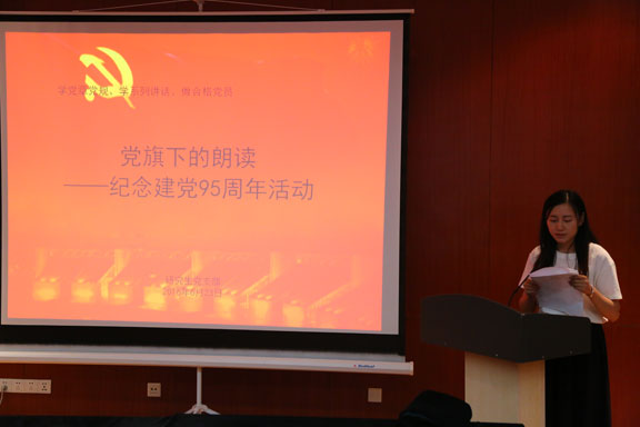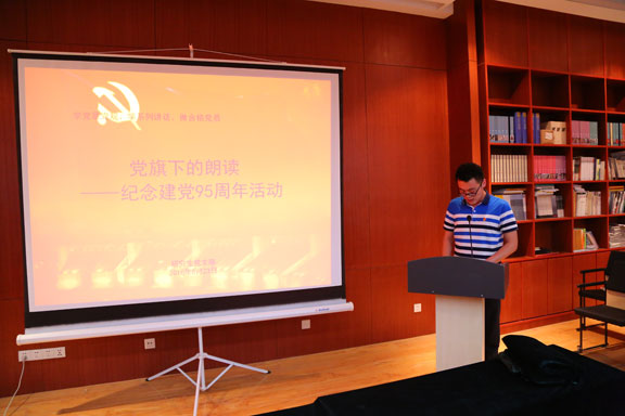 为庆祝中国共产党建党95周年,6月23日下午,研究生党支部在我校长清校区研究生学术活动室开展以“党旗下的朗读”为主题的庆祝建党95周年活动。全体研究生党员参加了本次活动。 活动中,研究生党员们围绕主题在庄严的背景音乐中,用饱含深情的文字、真挚朴素的情感朗读了《光的赞歌》、《面对鲜红的党旗》、《党旗飘扬在21世纪的春天》等诗歌散文,讴歌了95年来党的光荣历史,表达了研究生党员热爱党、发扬党的优良传统,继承党的伟大事业的坚强决心。