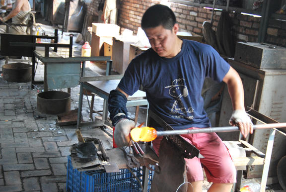 工人正在制作琉璃器皿