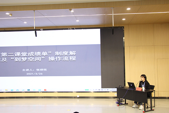 培训第四场,由第二课堂运营中心的张琪悦同学带来关于“第二课堂成绩单”制度解读及“到梦空间”操作流程的培训。张琪悦同学分别从活动程序流程,活动类型赋分以及“到梦空间”管理系统的应用三个方面进行讲解,使在座的各位基层学生团干部充分了解“第二课堂成绩单”制度及“到梦空间”操作流程。培训最后,全体基层学生团干部共同观看了红色影片《建党伟业》,一同回顾党的光辉历程,坚定团员理想信念,激励广大团员干部在新时期继续开拓创新、努力奋斗。