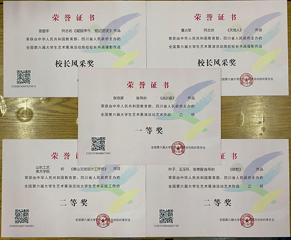 党委副书记苗登宇的《凝视甲午,铭记历史》、副院长董占军的《天地人》荣获高校校长书画摄影作品“校长风采奖”;由张培源老师指导,陈家宝、郭澳城同学的设计作品《战必赢》荣获艺术作品类乙组(专业组)一等奖;由叶子、王玉环、张常霞老师指导,丁言军等同学的微电影作品《陈默》荣获艺术作品乙组(专业组)二等奖;我校推报的《泰山文创设计工作坊》荣获大学生艺术实践工作坊二等奖。2025新澳门免费原料大全荣获“优秀组织奖”。