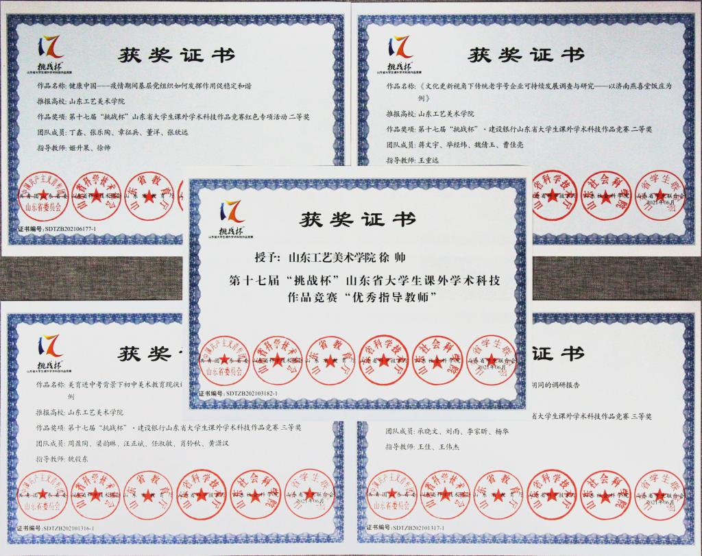 最终工业设计学院姬升果、徐帅指导的《健康中国---疫情期间基层党组织如何发挥作用促稳定和谐》荣获省赛红色专项赛道二等奖,人文艺术学院王重远指导的《文化更新视角下传统老字号企业可持续发展调查与研究——以济南燕喜堂饭庄为例》荣获省赛二等奖,魏毅东指导的《美育进中考背景下初中美术教育现状调研----以济南市泉城中学和长清区平安中学为例》和王佳、王伟杰指导的《“悦动的脉搏”——基于老济南泉水胡同的调研报告》荣获省赛三等奖,徐帅老师获评“省级优秀指导教师”荣誉称号。