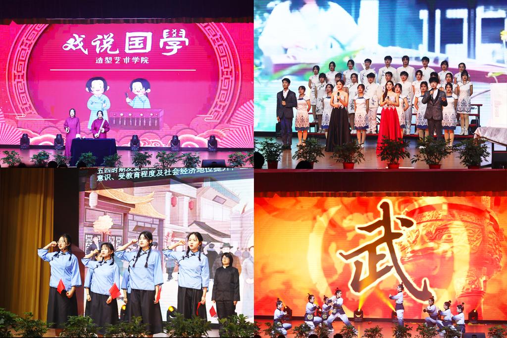 本次活动以“礼敬中华 传承经典”为主题,来自各学院(部门)的十支队伍,用不同形式向在场观众展示出优秀传统文化的魅力。视觉传达设计学院代表队《唐代煎茶礼仪》重现了制茶、泡茶、饮茶的各个过程,溯回盛世唐朝的繁荣昌盛,领略茶文化的历史传承;建筑与景观设计学院代表队小品《刺秦》,重现历史典故《荆轲刺秦王》;服装学院代表队用一首《墨梅》传唱出中华传统文化应运而生的傲气;基础教学部代表队的器乐舞蹈表演《骁》以传统乐器为媒介,展现了艺术的悸动与青春的萌芽;工业设计学院代表队《诵读华夏,传承经典》以诗朗诵的形式带领大家寻找万里河山的广阔,体验千年文字的魅力;造型艺术学院代表队相声表演《戏说国学》将国学与相声进行交织碰撞,让传统文化实现“新”传承;数字艺术与传媒学院代表队以武术表演《剑心书韵》尽显英姿,弘扬了武术哲学的精髓,展现了中华儿女的英姿飒爽;人文艺术学院代表队《古韵新声》通过古文吟诵的方式将历史长河中绚丽璀璨的瑰宝迸发出振聋发聩的声音与力量;应用设计学院代表队《华夏有衣,一眼千年》以服装秀的形式表现出“衣冠上国,礼仪之邦”的大国风姿;现代手工艺术学院代表队《又见敦煌》通过美轮美奂的舞台表演带领大家穿越千年时空,又闻悠悠驼铃。